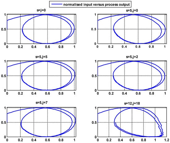 When the flow process model given in Equation (6) was placed in series with the stiction model, the closed-loop response of the flow model with stiction is represented in Figure 7. The process outputs were obtained for 6 different combinations of ‘S’ and ‘J’ values, and the process output versus input is plotted in Figure 7. The graph shows that by varying the values of ‘S’ and ‘J’, the shape of the input versus the output is slightly varied in terms of the orientation and amplitude of these graphs. Both the controller output and manipulating variables were normalized and then plotted to obtain their relationships.