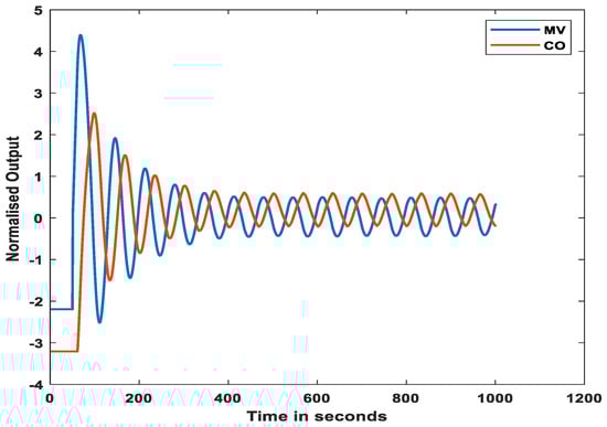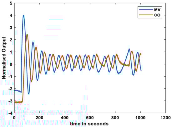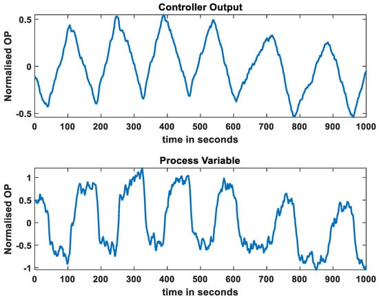 Before the neural network was trained, data preprocessing was performed. From the generated data, a window of precisely 500 discrete-time signals of both the PV and OP was selected. To train the artificial neural network, the values of PV and OP of the N time stamp were needed. Therefore, if both PV and OP were considered, and an output with 2 N time samples was produced in total. This can increase the training period and can take up a large amount of memory. Therefore, to reduce the total number of time samples, dimensionality reduction must be performed. This paper considers two methods, D-values and PCA, and their respective performances are discussed in the Results Section. The original process variable and controller output of a control loop (CHEM 1 of ISDB) are shown in Figure 10.