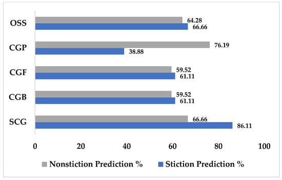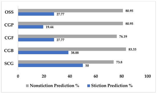 A similar test was also performed on the data that were reduced by PCA to determine which learning algorithm and set of training data yielded the highest results. Through this test, it was found that the combination of datasets involving variances of 0.010.5, 0.040.5, and 0.050.5 gave the best results. By comparing their performances to those of the learning algorithms, a similar prediction in terms of accuracy was achieved when using SCG or the conjugate gradient with Powell/Beale restart (CGB), as shown in Table 6. Although their overall prediction accuracies were similar, the abilities of both methods to detect stiction and nonstiction loops were different. While SCG had a prediction accuracy of 50%, CGB achieved even worse results, with a performance of 38.88%. However, the nonstiction prediction performance of CBG was higher than that of SCG, with the former having a prediction accuracy of 83.33% and the latter having a prediction accuracy of 73.80%, as shown in Figure 15.