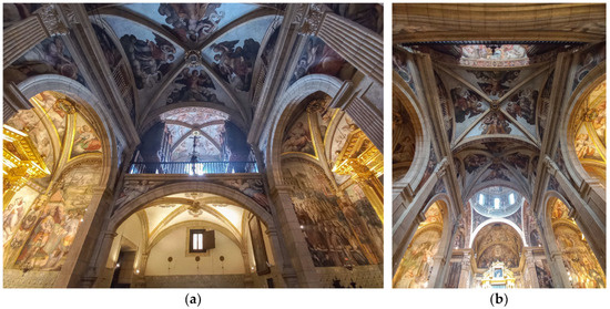 (a) A view of the vaults of the choir and side chapels of the Colegio del Patriarca; (b) a view of the vaults of the nave and main altar of the Colegio del Patriarca. Source: Concepción López-González (2022).