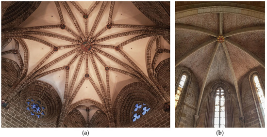 (a) A view of the star-shaped ribbed vault of the Chapel of the Holy Chalice in Valencia Cathedral (source: Renan Rolim (2019)); (b) a view of the ribbed vaults of the presbytery of the church of San Juan del Hospital (source: Renan Rolim (2023)).