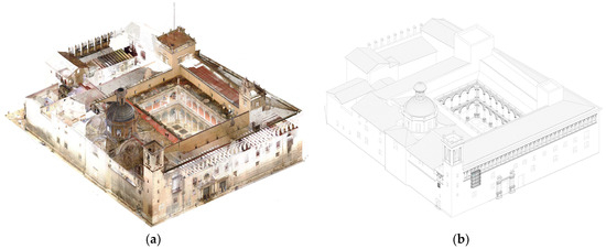 (a) Point cloud of Colegio del Patriarca (source: Junshan Liu and Danielle S. Willkens (2023)); (b) 3D model of the Colegio del Patriarca. Own elaboration from the point cloud taken in 2023 by Junshan Liu and Danielle S. Willkens.