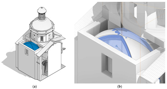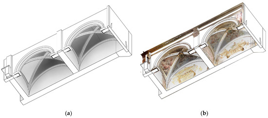 (a) Bottom view of the modelling of the vaults using the mass tool; (b) bottom view of the modelling of the vaults using the mass tool with the point cloud overlay. Source: own elaboration (2024).