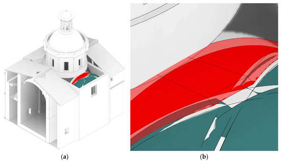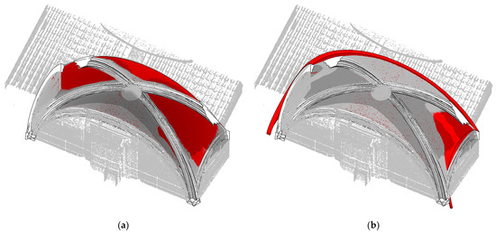 Overlay of the point cloud (in grey) and the 3D model (in red) of the vault showing the geometric divergence between the modelled vault and the point cloud. It can be seen that the vault modelled separately as a mass layer (a) is visibly more accurate than the vault modelled as a single element (b). Source: own elaboration (2024).