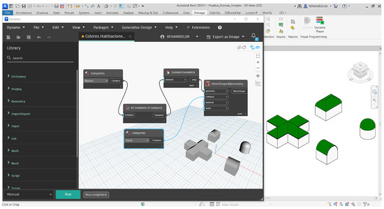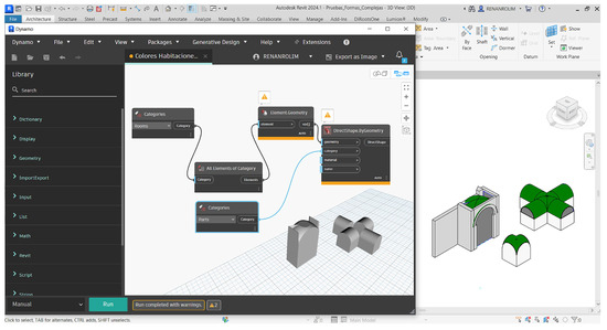 In order to ascertain the shapes that presented errors when generating volumes in Revit using the Dynamo plug-in, a series of tests was conducted. The results demonstrated that simple shapes, including cubes, parallelepipeds, prisms and hemispheres, could be generated and displayed perfectly on both the Autodesk Dynamo plug-in screen and the Autodesk Revit software screen (Figure 12).