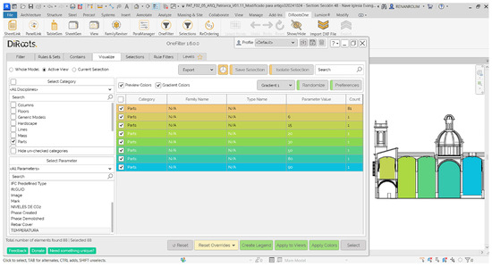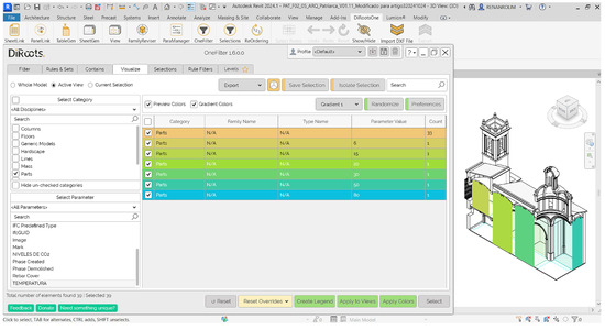 The developed process was divided into three phases, each employing a different set of tools (Table 1). In the initial phase, the Autodesk Revit 2024 software was utilised to generate a 3D model of the Real Colegio-Seminario de Corpus Christi in Valencia (Figure 4). This model was based on a point cloud provided by two researchers, PhD Junshan Liu, a Full Professor at Auburn University, and PhD Danielle S. Willkens, an Associate Professor at the Georgia Institute of Technology, collaborators in the HBIMSIG-Tourism project of the Universitat Politècnica de València. The second phase involved the materialisation of the interior spaces of the church as volumes in Revit itself, facilitated by the Autodesk Dynamo plug-in. In the third and final phase, the DiRoots plug-in was employed to filter the information inserted in the materialised volumes and to visualise it with a heat map.