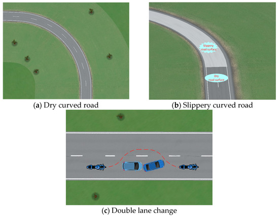 Figure 2 depicts three common motorcycle cornering scenarios: curve negotiation, emergency obstacle avoidance, and wet road cornering. (a) Curve scenario: This scenario represents riding on smoothly curved paths, typically encountered during road turns, embodying standard cornering situations. (b) Wet curve scenario: This scenario mimics road conditions compromised by water or other fluids, significantly reducing the adhesion coefficient of the road surface. It highlights the challenges of cornering on slippery surfaces. (c) Emergency obstacle avoidance (double lane change): This scenario simulates a motorcycle’s maneuver to quickly change lanes to bypass an obstructing vehicle and then return to the original lane. It addresses the need to respond to sudden obstacles or accidents in the motorcycle’s current lane while traveling across dual lanes. The simulation segments in this study leverage these scenarios to validate the system’s efficacy. Notably, the transition from a dry straight road to a slippery curved road serves as a critical test for evaluating the motorcycle’s anti-skid capabilities under dangerous conditions.
