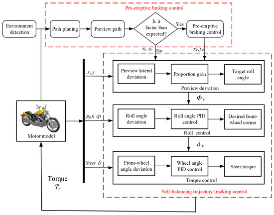 Motorcycle balancing is achieved through front-wheel steering, which compensates for the steering angle to maintain stability during cornering and lane changes, thereby avoiding obstacles. Additionally, pre-emptive braking adjusts the speed to a desired value while navigating curves, enhancing the motorcycle’s active safety performance. In motorcycle control, there is a particularly high demand for real-time performance and stability. The PID controller, known for its maturity and widespread application, offers excellent versatility and robustness in system design, effectively managing various operational conditions. While fuzzy logic control can address uncertainty, its design and tuning process is more complex and requires a thorough understanding of fuzzy rules and membership functions. In contrast, the PID controller has a straightforward structure that is easy to implement and debug, with intuitive parameter adjustments, making it well-suited for rapid iteration. The effectiveness of the proposed control system is validated through joint simulations using Matlab/Simulink and BikeSim under three typical operating conditions. The study concludes with the following findings: