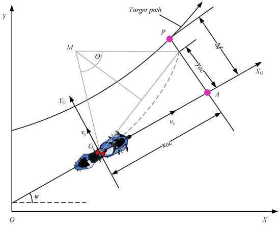 The preview follower theory is a control method that anticipates the path in advance. In this approach, the motorcycle is treated as a driver model, where the driver selects an appropriate preview point within their field of view based on information from the reference trajectory ahead. This point is used to generate the corresponding front-wheel steering angle, allowing for precise tracking of the self-driving motorcycle along the reference trajectory. Essentially, this method involves controlling the lateral dynamics of the motorcycle. In Figure 4, OXY is the geodetic coordinate system, with point O marking the center of the driving trajectory’s circle. The angle θ denotes the circle’s angle, P is the target point on the target trajectory, and A is the preview point, defined by the equations Ax = Gx × Tpre × cos(φ) and Ay = Gy × Tpre × sin(φ), where φ is the current heading angle. The subscripts x and y denote horizontal and vertical coordinates in geodetic coordinates, respectively, while Tpre is the pre-sighting time, set at a constant value of 1.3 s in this study. The coordinate system OGXGYG represents the motorcycle’s reference frame, and ∆f signifies the lateral deviation of the preview point from the target point, calculated as ∆f = (Px − Ax) × cos(φ). XCG and YCG represent the motorcycle’s displacements within the XGYG coordinate system, and the motorcycle’s combined velocity vector is tangent to its trajectory at point G. The function in MATLAB is utilized to perform calculations during travel and provide preview information into the controller for subsequent corner control.