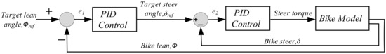 The control flow presented in this study is illustrated in Figure 5. Here, ϕref and δref represent the desired roll angle and steering angle, respectively, while ϕ and δ denote the actual lateral inclination angle and steering angle. The first PID layer manages the lateral inclination error e1 to adjust the steering angle, providing an initial steering angle for trajectory tracking. The second PID layer controls the steering angle error e2, refining the steering angle and converting it into steering torque, which is then output to BikeSim for steering.
