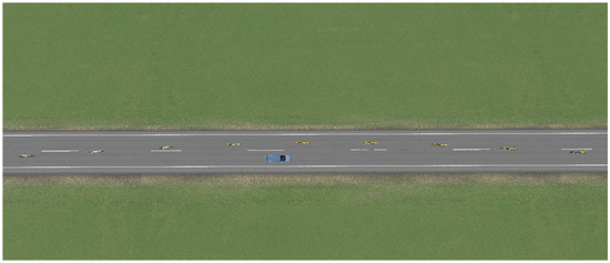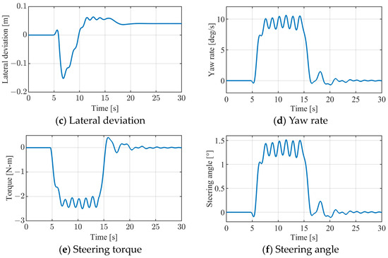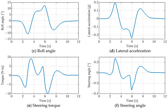 The double lane change scenario simulates common driving situations such as overtaking and obstacle avoidance. After debugging, the first PID layer was configured with kp1 = 20, ki1 = 10, and kd1 = 1, while the second PID layer was set with kp2 = 0.1, ki2 = 0.1, and kd2 = 0. With these parameters, the motorcycle successfully stabilizes its body roll motion and maintains balance through steering control. Figure 6 displays the motorcycle’s performance at 72 km/h in the BikeSim phantom simulation. Figure 7a–d illustrate the trajectory, lateral deviation, roll angle, and lateral acceleration of the motorcycle at this speed, while Figure 7e,f present the steering torque and front-wheel steering angle, respectively. The simulation results indicate that the maximum lateral deviation from the tracking path does not exceed 0.6 m, and the maximum roll angle remains below 15°. This shows that the motorcycle can follow the predetermined trajectory within the lane while maintaining balance. Additionally, the lateral acceleration stabilizes towards the end of the maneuver. There is a clear correlation between the front-wheel steering angle and steering torque, indicating that torque compensates for changes in the front-wheel steering angle during operation. By employing torque compensation, the system effectively achieves trajectory tracking and balance, resulting in excellent control performance during steering maneuvers.