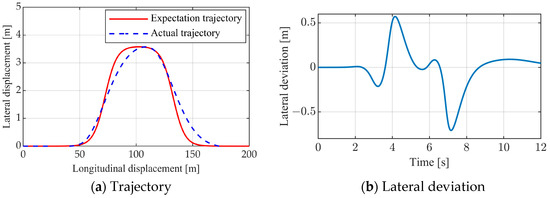 (2) In the dry pavement curve condition, navigating a circular curve with a radius of 60 m at a speed of 72 km/h resulted in a maximum lateral inclination angle of nearly 40°, compared to approximately 15° in the double lane change scenario. Despite this increased inclination, lateral deviation was maintained within ±0.6 m, ensuring the motorcycle remained within the lane at all times. The compensation of the front-wheel steering angle effectively mitigated any risk of rollover.