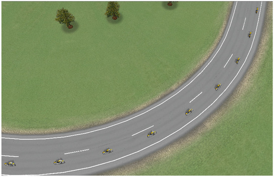 Figure 8 illustrates the BikeSim phantom simulation of the vehicle navigating a curved road with a radius of 60 m at a speed of 72 km/h. The results in Figure 9 show that the lateral deviation remains within ±0.6 m, consistently staying within the lateral boundaries of the lane. The maximum roll angle of the motorcycle stays below 20°, demonstrating a smooth variation trend that returns to the initial state, indicative of excellent stability. It is noted that the handlebar torque shows more significant fluctuations in relation to the front-wheel steering angle, highlighting the pronounced and frequent compensatory effect of the handlebar torque on the front-wheel steering angle under curved road conditions.