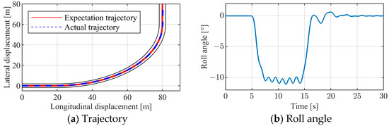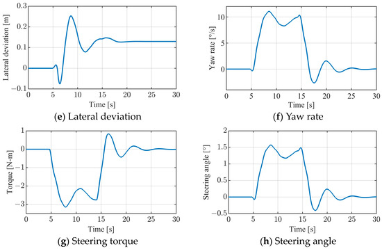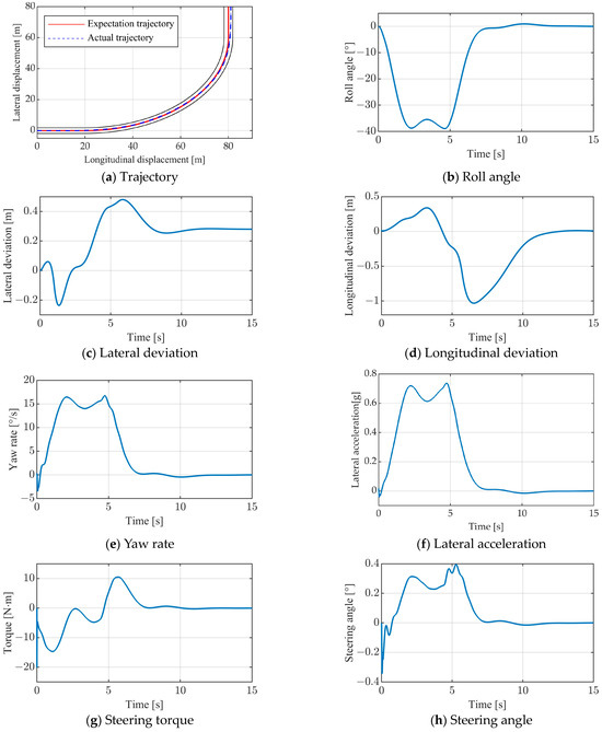(1) In the double lane change collision avoidance scenario, the actual trajectory remained within the lane width, ensuring that the motorcycle stayed within the lane throughout the maneuver. The maximum lateral tracking error did not exceed 0.6 m, and the maximum lateral inclination angle remained below 15 degrees. The adjustments in front-wheel steering angle and handlebar torque were gradual, resulting in the eventual stabilization of the motorcycle.