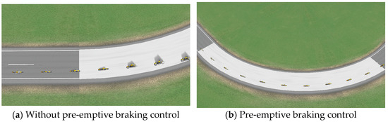 To validate the pre-braking system, a simulation was conducted on a wet, slippery road with a reduced road friction of 0.3 while navigating a curve. A comparison was made between systems with and without pre-braking. The scenario is illustrated in Figure 2c, with an initial speed of 72 km/h and a curve radius of 60 m. Figure 10 presents the BikeSim simulation phantom image, while Figure 11 shows the simulation results. In Figure 10a, the vehicle without pre-braking control deviates from its trajectory at the 30 m mark due to insufficient lateral force, ultimately sliding out of the lane. Figure 11b indicates that within the first second, the roll angle of the motorcycle without pre-braking control suddenly increases to around 80 degrees, signaling an imminent rollover. The pre-emptive braking system calculates the maximum safe passing speed at approximately 47 km/h, as per Equation (6). However, this speed does not account for the dynamic characteristics of the motorcycle, such as sideways leaning and steering. To enhance safety, this speed is adjusted downward by 20% to 36 km/h. Additionally, the maximum braking deceleration of 0.3 g is considered according to Equation (7), resulting in a calculated braking distance of 50 m. The simulation results indicate that the vehicle’s speed decreases to about 36 km/h before entering the curve, with maximum braking deceleration maintained between 0.3 g and 0.4 g. At this speed, the vehicle successfully navigates the corner, with lateral deviation not exceeding 0.15 m and longitudinal deviation not exceeding 0.35 m, both within the lane limits. Furthermore, the maximum lateral inclination angle remains below 20°, ensuring the motorcycle stays stable throughout the maneuver.