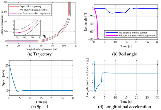 (3) Under wet and slippery road conditions, the motorcycle entered the curve at a speed of 72 km/h without pre-emptive braking intervention. Within a second, the motorcycle overturned as the lateral inclination angle rapidly exceeded 80 degrees. However, by integrating the pre-emptive braking system with the self-balancing system, the motorcycle decelerated to a safe speed before entering the curve. During the passage through the curve, the lateral inclination angle stabilized at a maximum of approximately 15°, and lateral deviation was reduced to within 0.25 m, resulting in improved stability.