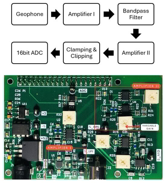 Figure 2 shows the seismic signal acquisition workflow which involves the geophone, amplifier I, bandpass filter, amplifier II, clamping and clipping circuitry, and the 16-bit ADC.