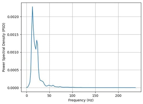To compute the spectral energy distribution, the spectrogram is split into frequency bands. In this research, twenty-five frequency bands were used. Let us denote the frequency band by . The energy within each frequency band is calculated by summing the squared magnitudes of the spectrogram’s elements within as follows: