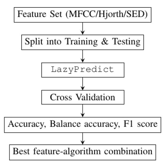 In our study, we used a dataset consisting of 7 rumbles and 60 non-rumble instances collected at Pinnawala Elephant Orphanage. Given the limited size of our dataset, we employed cross-validation to evaluate the performance of ML models, ensuring a more robust assessment of model generalization. As shown in Figure 6, the LazyPredict received the MFCC, Hjorth, or spectral energy distribution feature set and executed the corresponding ML algorithms. For each ML algorithm and feature set combination, the performance was recorded in terms of accuracy, balanced accuracy, and F1 score. It is worthwhile to note that here, we present the best performing ML algorithms for a given set of features, and the use of a set of features, e.g., MFCC, is not limited to the presented ML algorithms only. Furthermore, we may employ an early fusion of features (before the classification) or a late fusion of classification results (using an ensemble learning approach with a selected set of ML algorithms) to improve the classification performance. We intend to incorporate these approaches in future work.