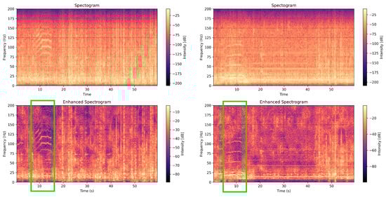 Spectrograms of two relatively strong rumbles verified by video-audio proof, before (top) and after (bottom) the enhancement using the proposed algorithm. The green boxes indicate the regions corresponding to two rumbles.