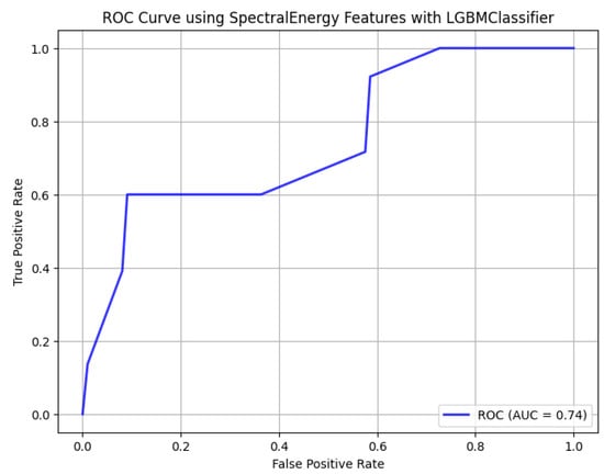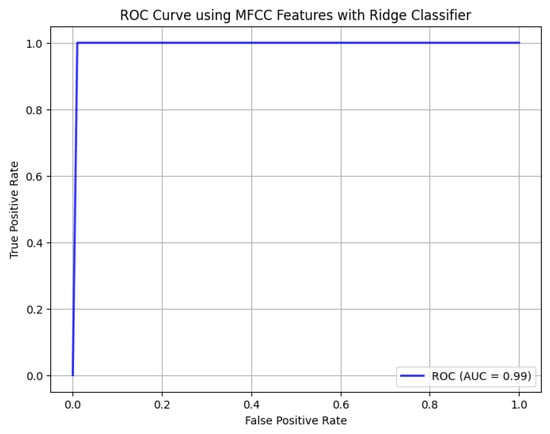 The performance of the best model for each feature extraction method was assessed using ROC curves, shown in Figure 10, Figure 11 and Figure 12. The ridge classifier performed exceptionally well with an AUC of 0.99, indicating near-perfect classification. The decision tree classifier achieved an AUC of 0.88, while the LGBM classifier reached a respectable 0.74. Overall, the combination of MFCC features and the ridge classifier was the most effective for the classification task.