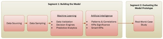 This research aims to supplement traditional methods of defining KPIs by integrating DDA techniques for business optimization and sustainability. The focus is on analysing business data generated by systems integrated through PDA to identify patterns, correlations, and trends within the data. This will enable the creation of SKPIs that can adjust dynamically to changing business conditions. The methodology depicted in Figure 1 encompasses two segments. The first segment involves the development of the DDA model through a four-step process of performing data sourcing; data sampling; ML (data validation, decision engines, and predictive analytics); and AI (patterns and correlations, KPI significance, and SKPIs). The second segment involves evaluating the developed model using case study methods, considering the complexities of an ecosystem that generates substantial amounts of performance-relevant data.