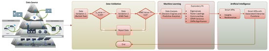 Therefore, this research is aimed at inventing a model to supplement traditional KPIs by looking at business data, identifying relationships and trends, and creating new smart KPIs (SKPIs) that dynamically adjust themselves as business evolves and data change. To achieve this, this study uses a data-driven automation model that leverages cross-functional KPIs (CFKPIs) generated within an integrated ecosystem. The CFKPIs are then validated for correlation and suitability using machine learning (ML) techniques, namely, Bartlett’s test of sphericity and the Kaiser–Meyer–Olkin (KMO) test of sampling adequacy. This study further uses ML to implement decision engines and predictive analytics. In addition, artificial intelligence (AI) techniques of exploratory Factor Analysis (FA) were employed to identify data patterns, correlations, and significance levels of CFKPIs. This, in turn, helped to create SKPIs tailored for business optimization. To achieve this, the following research objectives were formulated:
