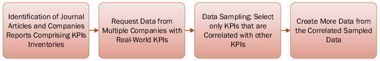 Data sourcing and sampling is a pivotal process, as the validity of the model outcomes depends on the dataset provided to the model. Illustrated in Figure 4, the process of data sourcing and sampling commenced with the identification and review of journal articles and reports from companies with published inventories of KPIs from respective ecosystems. Subsequently, companies that produced real-world KPI data were identified and requested to make data available where possible. These data were statistically analysed to select only correlated data. Subsequently, a scientific method was applied to create more correlated data that would be sufficient to develop the model.