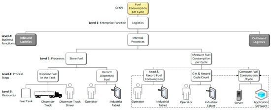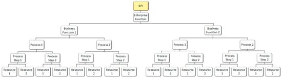 Each KPI is embedded within a complex hierarchical framework, comprising multiple interconnected layers. Specifically, each KPI is characterized by a set of attributes, including enterprise function, business function, business process, process step, and resource. To provide a meaningful business context and to facilitate informed decision-making, these properties were systematically assigned to each KPI, as depicted in the hierarchical structure in Figure 5, subsequent to a rigorous validation process.