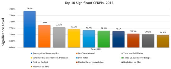 The DDA model identified the primary drivers of the business by applying ML and AI techniques to the CFKPI dataset for the year 2015, as discussed in previous sections. When the same techniques were applied to the CFKPI datasets for 2016 and 2017, distinct business drivers emerged for each year. To ensure consistency, the same CFKPI names and quantities used in the 2015 dataset were applied to the 2016 and 2017 datasets. The only variation between the three datasets was the actual data values produced by these CFKPIs for each year. This approach guarantees that the model is driven solely by data generated by the mine’s systems, rather than changes in the CFKPI names, count, or other factors. Table 4 provides a summary of the key properties for each dataset, including the number of datapoints, t, df, p-value, KMO, total variance explained, top ten significant CFKPIs, and the resulting number of SKPIs.