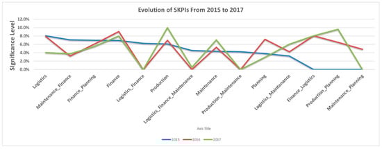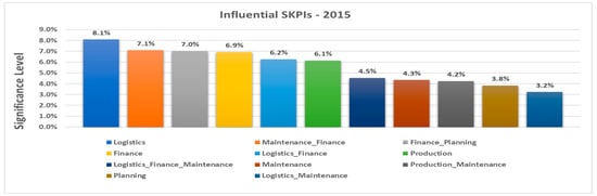 The analysis revealed the dominant enterprise functions associated with each SKPI. Specifically, the SKPIs were dominated by variables from the following enterprise functions: SKPI 1 (Logistics); SKPI 2 (Maintenance and Finance); SKPI 3 (Finance and Planning); SKPI 4 (Finance); SKPI 5 (Logistics and Finance); SKPI 6 (Production); SKPI 7 (Logistics, Finance, and Maintenance); SKPI 8 (Maintenance); SKPI 9 (Production and Maintenance); SKPI 10 (Planning); and SKPI 11 (Logistics and Maintenance). Figure 14 illustrates the new SKPIs in order of dominance for the year 2015.