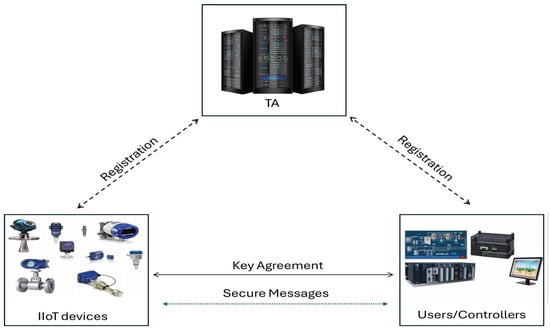 As shown in Figure 1, the system model suggested in this study has three discrete entities: (1) a Trusted Authority (); (2) a User (); and (3) Industrial IoT devices (). Both Internet of Things (IoT) devices and users/controllers are presumed to have tamper-resistant memory, which ensures that data, including shared authentication keys, stored within this memory cannot be illegally accessed [25].