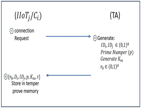 It is important to acknowledge that adding devices or users/controllers to industrial systems (the scope of this paper) requires careful planning and approval. Any changes or modifications to the system can disrupt the production process and potentially impact the automation system that governs the underlying process/manufacturing. In addition, every device within the industrial system will be assigned specific communication partners that collaborate with the IIoT device to retrieve and utilize specific data for control decisions. These devices must be identified and programmed into the PLC/SCADA system during the installation process. Given that the addition of new devices to the system requires prior planning and direct oversight from system engineers, it is reasonable to assume that the channels between the TA, users, and IIoT devices are secure and free from any advisory interference during the registration phase. Furthermore, this implies that the online registration phase occurs exclusively at time , which corresponds to the moment when a new device is introduced into the system.
