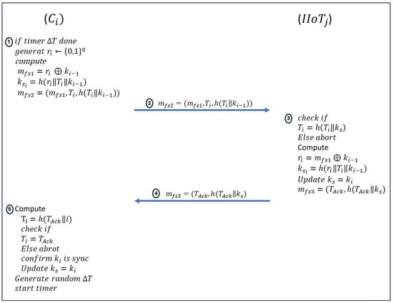 In authentication methods that use symmetric keys, session keys are often derived from shared keys. Recognized limits include the risk of insider compromise and the vulnerability to side-channel attacks. As a result, it is critical to protect previous communication sessions, emphasizing the importance of forward secrecy. This means that even if a long-term secret key is disclosed, the previous session key cannot be recovered. This feature enables the deployment of finite-lived session keys in our suggested solution for IIoT environments. In our proposed scheme, the FS stage starts every time expires. The steps for forward secrecy are as follows: