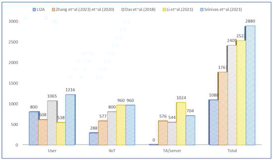 Communication costs: To achieve the security level corresponding to the 1024-bits RSA algorithm, we represent the lengths of various elements as follows: for the hash function (256 bits), for the message Xored with a key (256 bits), for a random number (256 bits), for an identifier (32 bits), and for a timestamp (32 bits). In the key agreement phase of the LI2A scheme, initiates the process by sending a message to . responds by sending a message to . Consequently, the communication costs are as follows: 800 bits for the user side , 288 bits for the side , and 0 bits for the as it only participates in the online registration. The communication costs are compared to those of other state-of-the-art schemes in Figure 5. It can be seen that LI2A outperforms these schemes in terms of overall communication cost.