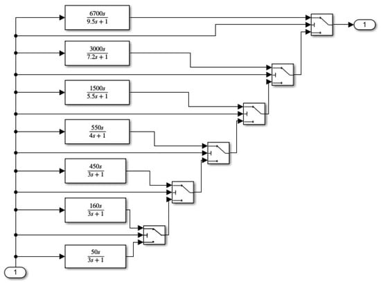 The ship U-turn operation in the port can be divided into two parts. One is the feed-forward link of large angle turning, which can improve the sensitivity of the system and speed up the response of the system [23]. In the process of a ship’s U-turn, in order to improve the response speed, the feed-forward control link is necessary. When the ship turns at a large angle without feed-forward control, the system response time will be quite long, which is very unfavorable for ship’s that need to make a U-turn in an emergency. Therefore, with the selection and judgment function of the switch, the ship steering angle is divided into seven zones: 0°–5°, 5°–15°, 15°–30°, 30°–50°, 50°–90°, 90°–130°, 130°–180°. The small angle range in each zone can take all the angle situations into account. The parameters of the feed-forward response link for the seven zones are as follows: , where s is the Laplacian operator. According to different turning angles, the corresponding interval can achieve a good control effect. The feed-forward controller is shown in Figure 1.