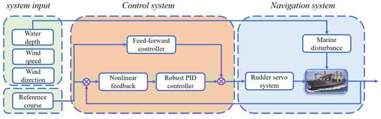 With advancements in control theory, model-based control methods have been increasingly applied to ships, including sliding mode control [1,2], adaptive control [3,4], and fuzzy control [5,6]. For instance, Chen et al. [7] explored the impact of water depth and speed on ship maneuverability and control and proposed an adaptive controller to enhance performance in shallow waters based on extensive experimental studies. The authors of Gao et al. [8] investigated the Boussinesq–Burgers system for shallow water waves, identifying transformations and similarity reductions to aid in understanding wave behavior near ocean beaches, which has implications for ocean engineering fields. The authors of Biagioli et al. [9] presented a modified shallow water equations model incorporating a scalar transport equation, utilizing a finite volume central–upwind scheme and an implicit–explicit Runge–Kutta method for the accurate and efficient simulation of geophysical flows with vertical profiles. The authors of Himaya and Sano [10] examined the combined effects of various loading and wind conditions on a container ship’s course-keeping performance, aiming to improve safe navigation practices by understanding the ship’s response to different environmental and operational scenarios. The authors of Lin et al. [11] introduced a particle swarm optimization (PSO)-based predictive PID-backstepping controller to enhance ship course-keeping performance under varying conditions, demonstrating improved efficiency and stability through simulation tests. The authors of Nguyen et al. [12] utilized computational fluid dynamics simulations to analyze the maneuvering characteristics of a container ship in shallow waters, revealing significant changes in roll and turning diameter compared to deeper waters, with results that align well with experimental data. The authors of Yin et al. [13] presented an integrated framework using enhanced LQR control and adaptive strategies for autonomous ship berthing, validated through simulations under various operating conditions. The authors of Li et al. [14] proposed a fuzzy logic-based human-like decision-making method for ultra-large ship berthing, validated with pilotage data, offering insights for autonomous navigation in port waters. The authors of Xu et al. [15] examined the impact of shallow water on vessel steering models using system identification methods and compared parameter estimation accuracy among different modeling techniques, demonstrating that shallow water significantly impairs ship maneuverability. The authors of Priya et al. [16] presented a mathematical model to analyze the motion of moored ships in harbors, incorporating strategies like porous breakwaters and wave absorbers to mitigate resonance and enhance safety in maritime navigation. The authors of Hu et al. [17] introduced a nonlinear feedback-based controller design that enhances system robustness, reduces energy consumption, and demonstrated significant practical engineering value through simulations with the training ship “Yupeng”. The authors of Rybczak and Lazarowska [18] outlined a method for autonomous ship operation in ports, utilizing the ant colony optimization algorithm for safe trajectory calculation and a combination of trajectory and low-speed controllers to maneuver a very large crude carrier model.
