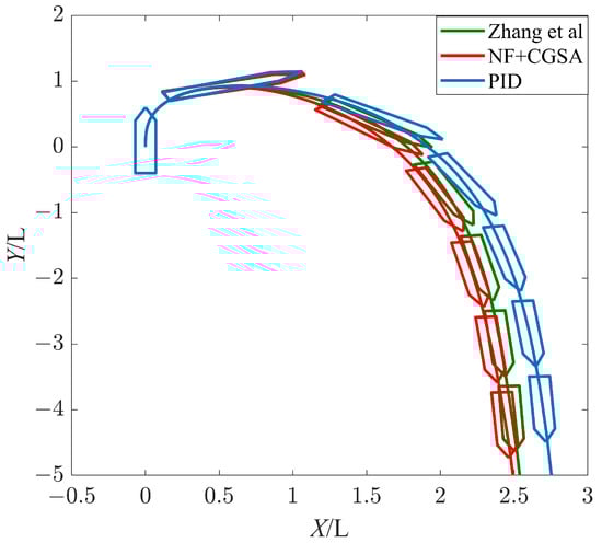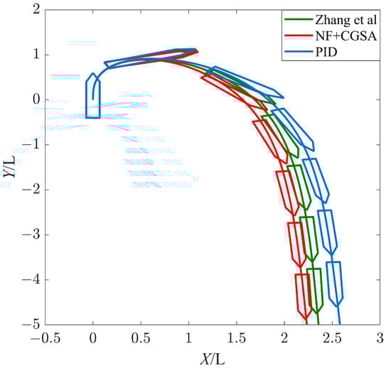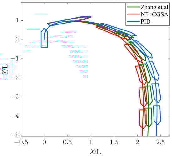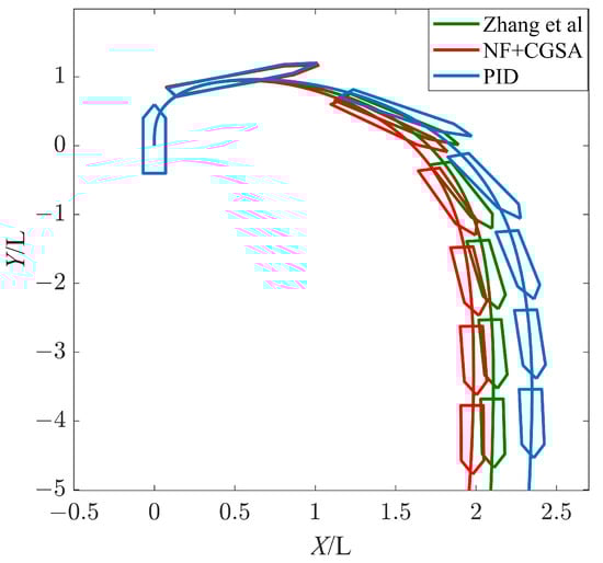 After many comparative experiments, this paper uses the arctangent function to improve the performance of the controller. The controller has a simple structure and is widely used in various engineering control applications; its parameters are easy to adjust. Therefore, this paper uses the robust controller obtained through the CGSA to control a ship’s automatic U-turn in a port. After many simulation experiments, the control effect is satisfied when .