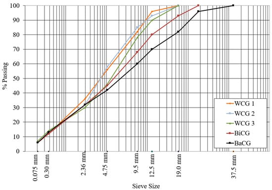 Crushed quartz sourced from the Amanat Baghdad asphalt concrete mix plant in Taji, north of Baghdad, was used to prepare the asphalt mixtures in this work. The coarse and fine aggregates were sieved and blended in appropriate proportions to meet the gradation requirements for surface, binder, and base courses, following ASTM D 3515. Five different gradations were evaluated: three for the surface course with varying aggregate fractions passing the 12.5 mm and 4.75 mm sieves, identified as WCG 1, WCG 2, and WCG 3, with WCG 3 having a higher proportion of coarse aggregate (retained on the 4.75 mm sieve) compared to the other two types of surface course mixes; one for the binder course (BiCG); and one for the base course (BaCG). The gradation of the used aggregate is shown in Figure 1. Moreover, the physical properties of the aggregate are presented in Table 2 and compared with the SCRB recommendations [].