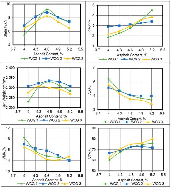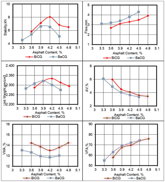 For the surface course mixes with different gradations, the Marshall plots, shown in Figure 2, depict the relationships between asphalt content and Marshall properties, including stability, flow, unit weight, air voids (AV%), voids in mineral aggregate (VMA%), and voids filled with asphalt (VFA%). The OAC obtained for WCG 1 and WCG 2 was 4.6% by weight of the total mix. For WCG 3, the calculated OAC was slightly lower at 4.53%; however, it was rounded to 4.6% for practical purposes. Similarly, the Marshall plots for the binder course (BiCG) and base course (BaCG) mixes are presented in Figure 3. The OAC values determined were 4.2% for BiCG and 3.9% for BaCG by weight of the total blend. These OAC values ensure optimal performance of the asphalt mixtures while meeting the specified Marshall property requirements.
