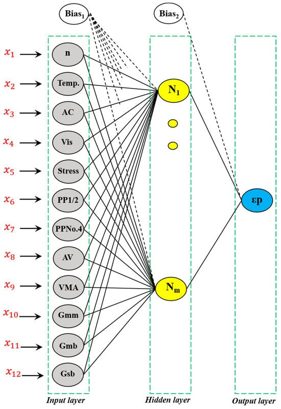 Recent developments in the field of artificial intelligence (AI) have introduced machine learning (ML) techniques as revolutionary tools that can be used to address challenging issues in pavement construction, maintenance, and distress prediction. In this regard, significant focus has been given to Artificial Neural Networks (ANNs) due to their exceptional ability to predict complex relationships and perform well with varying datasets []. Furthermore, ANNs do not have any explicit mathematical equation formulation as they are driven purely by the data, unlike the conventional empirical models that require a predetermined understanding of the problem at hand []. This mainly makes them useful for complicated problems such as permanent deformation resulting from the interaction between the used materials, loading, and environmental factors. Several efforts have been reported to implement the predictive capabilities of ANNs to estimate some essential concrete pavement performance indicators, including fatigue life and moisture susceptibility [,]. However, studies on using ANNs to predict permanent deformation parameters under relevant conditions are scant, creating a knowledge gap in the existing body of literature.