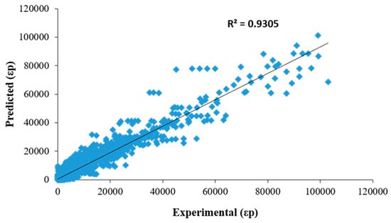 Predicted versus experimental (εp) values.