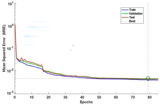 The results indicate that the accuracy of models improves by increasing the number of neurons in the hidden layer. However, the best performance of the model was achieved when seven neurons were used in the network, where the R2 and MSE values were converged and consistent across the data groups. Therefore, a network model with seven neurons was adopted in this study for predicting the (εp) values. Figure 5 shows a plot of all the predicted versus experimental (εp) data points. Figure 6 shows the high degree of convergence for the measured MSE of this model’s training, validation, and test datasets, where the best performance is achieved at epoch 79. The weights and bias results of the proposed model were extracted from the software and summarized in Table 7. In this table, the notation w1(i,j) represents the connection weights between the hidden layer (i) neurons and inputs (j), whereas w2(i) represents the connection weights between the neurons in the hidden layer (i) and the output. As illustrated in Figure 4, each neuron in the hidden layer (i) has a bias value of B1(i), whereas the output has a bias value (B2) equal to −0.7068.
