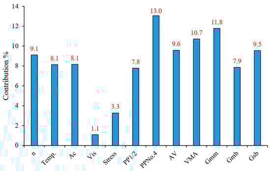 The results indicate that the percentage of aggregate passing the 4.75 mm sieve (PPNo.4) and theoretical maximum specific gravity (Gmm) were the most influential variables, contributing 13% and 11.8%, respectively. These findings align with those of [], who reported that aggregate gradation significantly impacts the rutting potential of asphalt mixtures due to its role in load distribution and shear resistance. The importance of Gmm is also consistent with previous research, which has shown that asphalt mixtures with higher Gmm values tend to have improved stability and resistance to permanent deformation []. In contrast, asphalt viscosity (Vis) and normal stress levels (Stress) were found to have the lowest contributions, with values of 1.1% and 3.3%, respectively. While these factors influence the mix behavior, their relatively lower impact can be attributed to their interaction with other variables, such as temperature and binder content, which have a more pronounced effect on deformation characteristics. This observation is consistent with the findings of [], who reported that stress levels alone do not fully dictate rutting behavior, as other parameters, including binder stiffness and mix volumetrics, play a more dominant role.