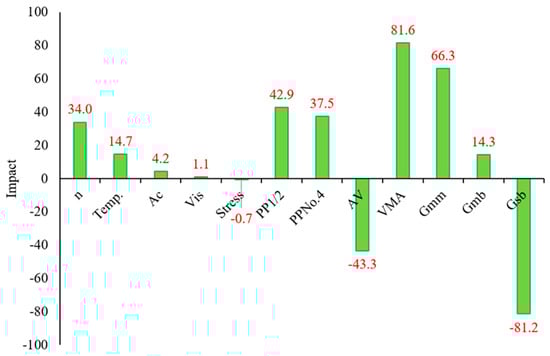 Figure 8 shows the computed impact of all input variables in the model. It is demonstrated that only the normal stress, AV, and Gsb variables negatively impact the permanent strain (εp) value. Within the investigated data, the marginal negative impact of normal stress can be attributed to its interaction with other variables, such as temperature and binder content, which have a more pronounced effect on deformation characteristics. This observation aligns with the findings of [], who reported that stress levels alone do not fully dictate rutting behavior, as other parameters, including binder stiffness and mix volumetric, play a more dominant role. Reducing the air void contents (AV) in asphalt mixes also makes the asphalt more susceptible to rutting due to the induced plastic deformation, where the mix becomes fully compacted and the ability of aggregates to interlock is reduced []. The negative impact of the Gsb on the permanent strain (εp) of asphalt refers to the fact that un-dense aggregates would generally have low Gsb that are prone to rutting as they are porous or soft, leading to a weak structure of early breaking down under heavy traffic loads [,]. In contrast, all the other variables (n, Temp., Ac, Vis, PP1/2, PPNo.4, VMA, Gmm, and Gmb) showed a positive impact on the (εp) value. These results prove that the developed ANN model reflects the presence and importance of each input variable in predicting the (εp) value. Practically, the results would help optimize asphalt mix designs and improve the future performance of asphalt pavement in terms of permanent deformation.