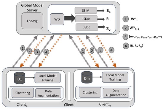 be the data where denotes the features of the i-th sample, and class is denoted as . A local model trained by each client m using the dataset D. Once the training is complete, the parameters of the local model are sent to the server for aggregation. These parameters are combined by server to update the global model. The objective of federated learning can be represented as minimizing the global loss function with model parameters w and loss function for client i :