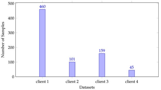 Most existing studies [,] compare centralized and federated approaches without considering real-time settings, where data from the same datasets are distributed across different clients. For a federated learning setup to be applicable in real-time settings, the model must be capable of handling data from different geographical locations with varying distributions. Training AI models in heterogeneous and large FL networks presents several challenges such as device heterogeneity, data heterogeneity, and communication overhead []. In federated learning, the variability in data distributions among various clients is referred to as data heterogeneity. Data heterogeneity may be due to various reasons, such as incorrect labeling, imbalance in the number of samples, and also due to data collection from multiple sources.