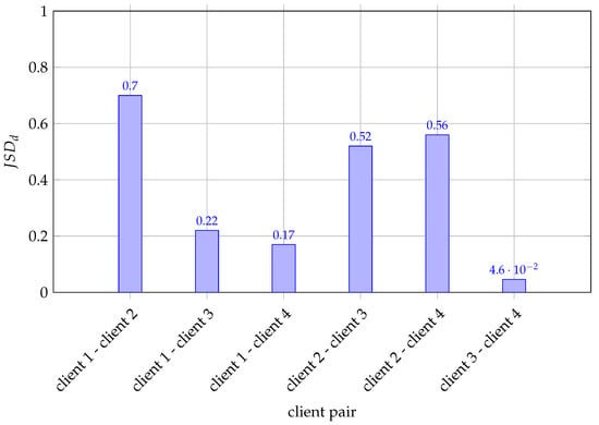 The inference from the Figure 3 and Table 9 (shown in bold) is that the Jensen–Shannon Divergence (JSD) values of client 2 with client 1, client 3, client 4 indicate a high level of divergence. This indicates that client 2 exhibits significant differences from client 1, client 3, and client 4 in their distributions. Such critical divergence implies that the underlying patterns or behaviors within client 2 differ substantially from those observed in client 1, client 3, and client 4. Hence, we can infer that the decrease in global accuracy is attributed to the participation of client 2.