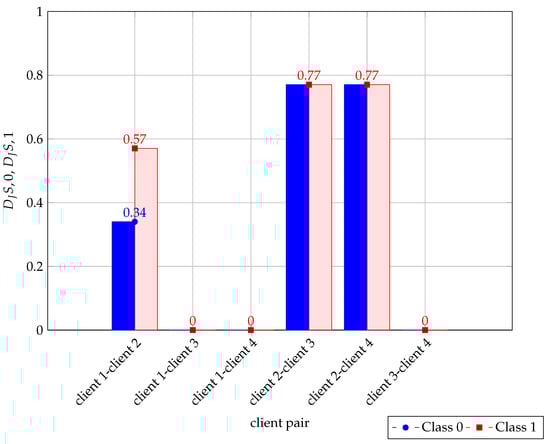 A JSD value below 0.1 suggests that the data associated with the clients are similar, while a value greater than 0.4 indicates significant dissimilarity. The results, as shown in Figure 4 and Table 10 (in bold), show significant divergence in the label distributions for client 2 with other clients for classes 0 and 1. Thus, we can infer that client 2 participation in the FL process affects the accuracy of the FL model.