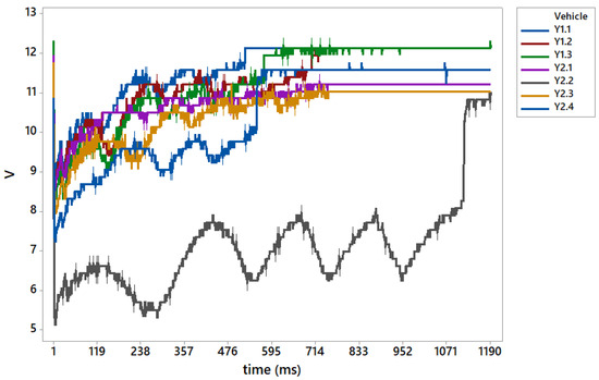 Filtered data collected for the 7 vehicles. The axis Y is the measured voltage (V) in each vehicle and the axis X is the time in milliseconds.